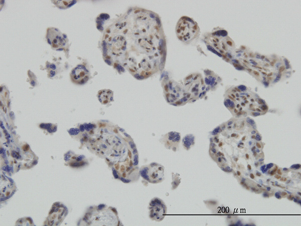 Immunoperoxidase of monoclonal antibody to RUNX2 on formalin-fixed paraffin-embedded human placenta. [antibody concentration 3 ug/ml] |