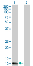 Western Blot analysis of S100A7 expression in transfected 293T cell line by S100A7 monoclonal antibody (M02), clone 1A4.Lane 1: S100A7 transfected lysate(11.457 KDa).Lane 2: Non-transfected lysate. |