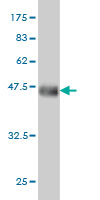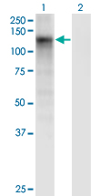 Western Blot analysis of DSE expression in transfected 293T cell line by DSE monoclonal antibody (M03), clone 6D4.Lane 1: DSE transfected lysate (Predicted MW: 109.8 KDa).Lane 2: Non-transfected lysate.