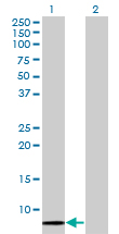 Western Blot analysis of SCGB1A1 expression in transfected 293T cell line by SCGB1A1 monoclonal antibody (M11), clone 1F7.Lane 1: SCGB1A1 transfected lysate(10 KDa).Lane 2: Non-transfected lysate.