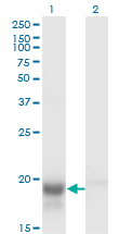 Western Blot analysis of SKP1 expression in transfected 293T cell line by SKP1A monoclonal antibody (M01), clone 1H8.Lane 1: SKP1 transfected lysate(18.1 KDa).Lane 2: Non-transfected lysate. |