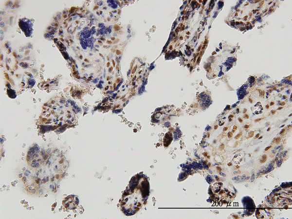 Immunoperoxidase of monoclonal antibody to SMAD2 on formalin-fixed paraffin-embedded human placenta. [antibody concentration 3 ug/ml] |