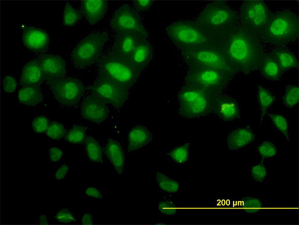 Immunofluorescence of monoclonal antibody to SNAI2 on HeLa cell. [antibody concentration 10 ug/ml] |