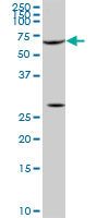 SRF monoclonal antibody (M03), clone 1E1. Western Blot analysis of SRF expression in A-431 ( AMM04135G ) |