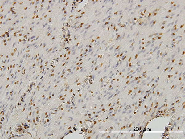 Immunoperoxidase of monoclonal antibody to STAG1 on formalin-fixed paraffin-embedded human smooth muscle. [antibody concentration 3 ug/ml] |