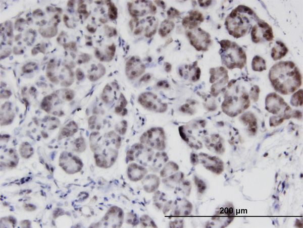 Immunoperoxidase of monoclonal antibody to STK40 on formalin-fixed paraffin-embedded human pancreas. [antibody concentration 3 ug/ml] |