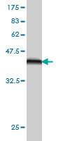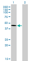 Western Blot analysis of T expression in transfected 293T cell line by T monoclonal antibody (M01), clone 5H8.Lane 1: T transfected lysate(41.1 KDa).Lane 2: Non-transfected lysate.