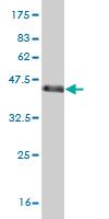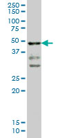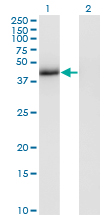 Western Blot analysis of T expression in transfected 293T cell line by T monoclonal antibody (M02), clone 5C5.Lane 1: T transfected lysate(41.1 KDa).Lane 2: Non-transfected lysate. |