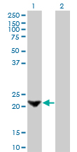 Western Blot analysis of TAGLN expression in transfected 293T cell line by TAGLN monoclonal antibody (M01), clone 1E2.Lane 1: TAGLN transfected lysate(22.6 KDa).Lane 2: Non-transfected lysate.