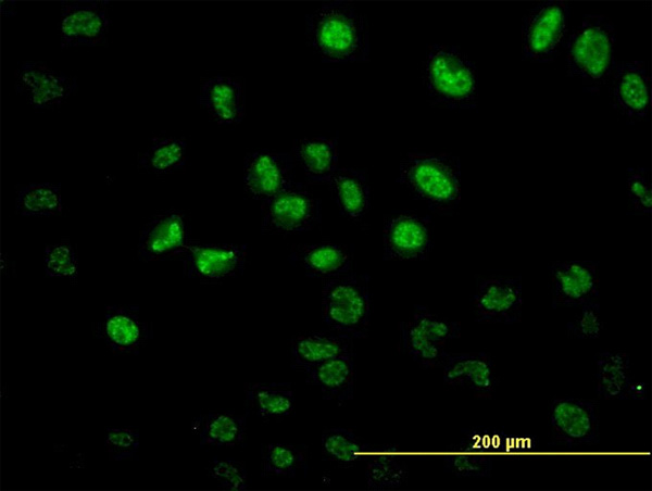Immunofluorescence of monoclonal antibody to TEAD1 on HeLa cell. [antibody concentration 10 ug/ml]