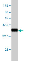 Western Blot analysis of TEAD4 expression in transfected 293T cell line by TEAD4 monoclonal antibody (M01), clone 5H3.Lane 1: TEAD4 transfected lysate(34.2 KDa).Lane 2: Non-transfected lysate. |