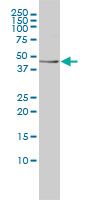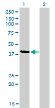 Western Blot analysis of TES expression in transfected 293T cell line by TES monoclonal antibody (M01), clone 1G11-B7.Lane 1: TES transfected lysate(48 KDa).Lane 2: Non-transfected lysate. |