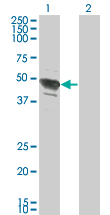 Western Blot analysis of TFAP2B expression in transfected 293T cell line by TFAP2B monoclonal antibody (M02), clone 2F6.Lane 1: TFAP2B transfected lysate(50.474 KDa).Lane 2: Non-transfected lysate.