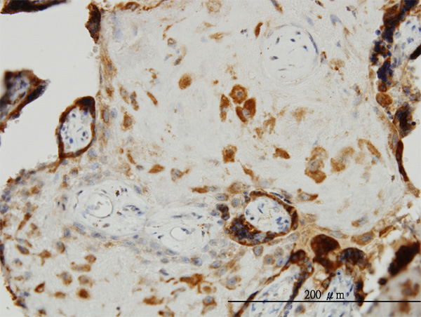 Immunoperoxidase of monoclonal antibody to TIMP2 on formalin-fixed paraffin-embedded human placenta. [antibody concentration 3 ug/ml]