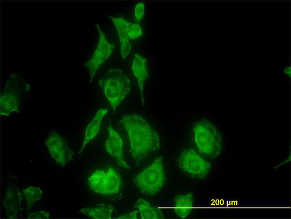 Immunofluorescence of monoclonal antibody to TIMP2 on HeLa cell. [antibody concentration 10 ug/ml] |
