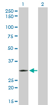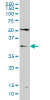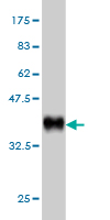 Western Blot analysis of TLX3 expression in transfected 293T cell line by TLX3 monoclonal antibody (M01), clone 2A3.Lane 1: TLX3 transfected lysate(31.9 KDa).Lane 2: Non-transfected lysate. |