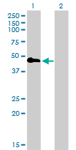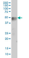 Western Blot analysis of TNFRSF19 expression in transfected 293T cell line by TNFRSF19 monoclonal antibody (M01), clone 2G4.Lane 1: TNFRSF19 transfected lysate(45.3 KDa).Lane 2: Non-transfected lysate. |