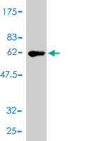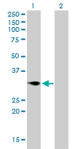 Western Blot analysis of TNFRSF7 expression in transfected 293T cell line by TNFRSF7 monoclonal antibody (M01), clone 1E2-A3.Lane 1: TNFRSF7 transfected lysate(29.2 KDa).Lane 2: Non-transfected lysate. |
