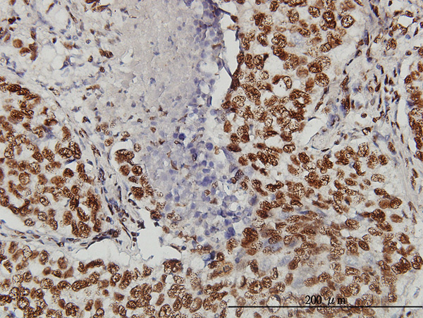 Immunoperoxidase of monoclonal antibody to TOPORS on formalin-fixed paraffin-embedded human lung, adenosquamous cell carcinoma. [antibody concentration 3 ug/ml]