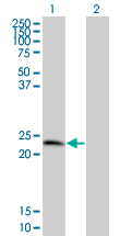 Western Blot analysis of TPD52 expression in transfected 293T cell line by TPD52 monoclonal antibody (M01), clone 1B6.Lane 1: TPD52 transfected lysate(19.863 KDa).Lane 2: Non-transfected lysate.
