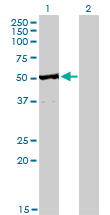 Western Blot analysis of TRAF4 expression in transfected 293T cell line by TRAF4 monoclonal antibody (M01), clone 3F6.Lane 1: TRAF4 transfected lysate(53.5 KDa).Lane 2: Non-transfected lysate.