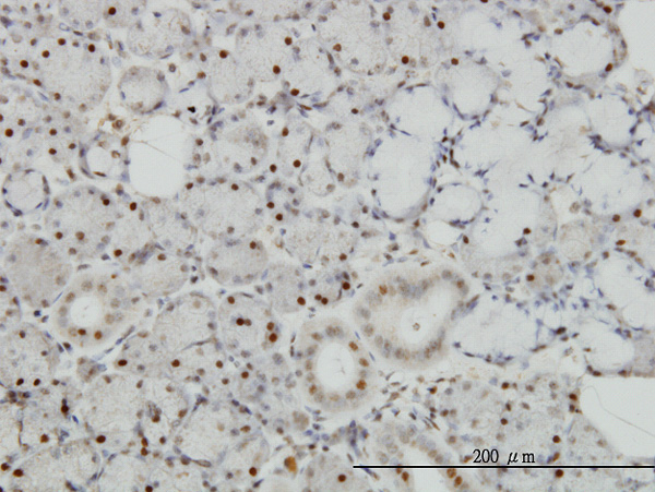 Immunoperoxidase of monoclonal antibody to TRAF4 on formalin-fixed paraffin-embedded human salivary gland. [antibody concentration 3 ug/ml] |