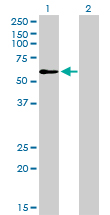 Western Blot analysis of TRAF6 expression in transfected 293T cell line by TRAF6 monoclonal antibody (M02), clone 1B2.Lane 1: TRAF6 transfected lysate(59.6 KDa).Lane 2: Non-transfected lysate.