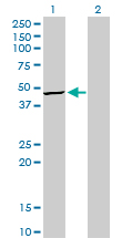 Western Blot analysis of TRIB3 expression in transfected 293T cell line by TRIB3 monoclonal antibody (M03), clone 1H2.Lane 1: TRIB3 transfected lysate(39.6 KDa).Lane 2: Non-transfected lysate.