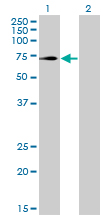 Western Blot analysis of TRIM32 expression in transfected 293T cell line by TRIM32 monoclonal antibody (M09), clone 2E5.Lane 1: TRIM32 transfected lysate(72 KDa).Lane 2: Non-transfected lysate.