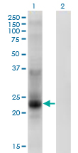 Western Blot analysis of TSPAN8 expression in transfected 293T cell line by TSPAN8 monoclonal antibody (M02), clone 1E5.Lane 1: TSPAN8 transfected lysate (Predicted MW: 26.1 KDa).Lane 2: Non-transfected lysate.