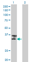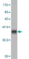 Western Blot analysis of TTN expression in transfected 293T cell line by TTN monoclonal antibody (M09), clone 6H5.Lane 1: TTN transfected lysate(32.8 KDa).Lane 2: Non-transfected lysate.