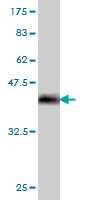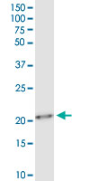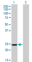 Western Blot analysis of TWIST1 expression in transfected 293T cell line by TWIST1 monoclonal antibody (M01), clone 3E11.Lane 1: TWIST1 transfected lysate(21 KDa).Lane 2: Non-transfected lysate. |