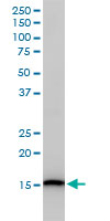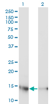 Western Blot analysis of UBE2D3 expression in transfected 293T cell line by UBE2D3 monoclonal antibody (M01), clone 4C1-1E3.Lane 1: UBE2D3 transfected lysate(16.7 KDa).Lane 2: Non-transfected lysate. |