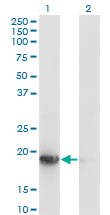 Western Blot analysis of UBE2G1 expression in transfected 293T cell line by UBE2G1 monoclonal antibody (M01), clone 1C12-1B2.Lane 1: UBE2G1 transfected lysate (Predicted MW: 19.5 KDa).Lane 2: Non-transfected lysate.