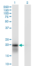 Western Blot analysis of UBE2H expression in transfected 293T cell line by UBE2H monoclonal antibody (M01), clone 3C4-1A2.Lane 1: UBE2H transfected lysate(20.7 KDa).Lane 2: Non-transfected lysate. |