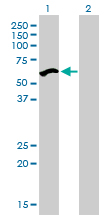 Western Blot analysis of UHRF2 expression in transfected 293T cell line by UHRF2 monoclonal antibody (M01), clone 3A11.Lane 1: UHRF2 transfected lysate(56.1 KDa).Lane 2: Non-transfected lysate.