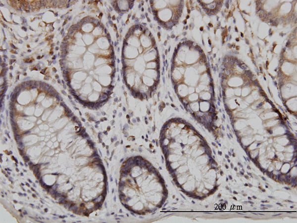 Immunoperoxidase of monoclonal antibody to USP48 on formalin-fixed paraffin-embedded human colon. [antibody concentration 3 ug/ml] |