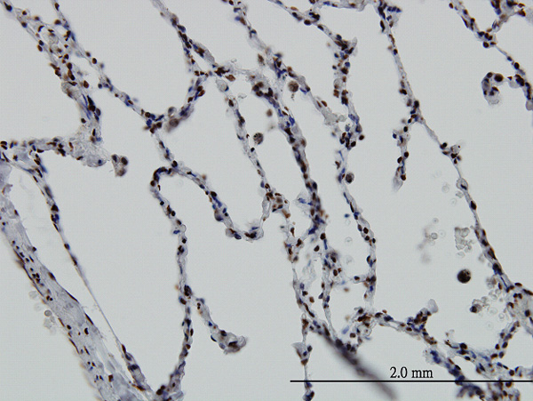 Immunoperoxidase of monoclonal antibody to VDR on formalin-fixed paraffin-embedded human lung. [antibody concentration 3 ug/ml]
