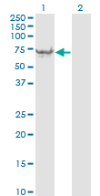 Western Blot analysis of VIM expression in transfected 293T cell line by VIM monoclonal antibody (M01), clone 3E9.Lane 1: VIM transfected lysate(53.7 KDa).Lane 2: Non-transfected lysate. |