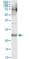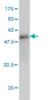 Immunoprecipitation of WISP2 transfected lysate using anti-WISP2 monoclonal antibody and Protein A Magnetic Bead (<a href="products_detail.asp?Catalog_id=U0007">U0007</a>), and immunoblotted with WISP2 MaxPab rabbit polyclonal antibody. |