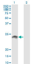 Western Blot analysis of WISP2 expression in transfected 293T cell line by WISP2 monoclonal antibody (M09), clone 3D10.Lane 1: WISP2 transfected lysate(26.8 KDa).Lane 2: Non-transfected lysate.