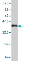 Western Blot analysis of YAP1 expression in transfected 293T cell line by YAP1 monoclonal antibody (M01), clone 2F12.Lane 1: YAP1 transfected lysate (Predicted MW: 54.5 KDa).Lane 2: Non-transfected lysate. |