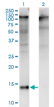 Western Blot analysis of ZBTB16 expression in transfected 293T cell line by ZBTB16 monoclonal antibody (M01), clone 3A7.Lane 1: ZBTB16 transfected lysate (Predicted MW: 11.11 KDa).Lane 2: Non-transfected lysate.