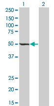 Western Blot analysis of ZWILCH expression in transfected 293T cell line by ZWILCH monoclonal antibody (M01), clone 1C9.Lane 1: ZWILCH transfected lysate(54.224 KDa).Lane 2: Non-transfected lysate.