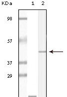 Figure 1: Western blot analysis using CIB1 mouse mAb against truncated CIB1 recombinant protein (1) and A431 cell lysate (2).