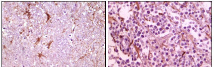 Figure 2: Immunohistochemical analysis of paraffin-embedded human thalamus (left) and glioma (right) tissue, showing membrane localization using CIB1 mouse mAb with DAB staining. |