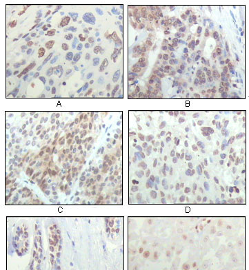 Figure 2: Immunohistochemical analysis of paraffin-embedded human esophageal squamous cell carcinoma (A), colon adenocarcinoma (B), liver carcinoma (C), skin carcinoma (D), breast ductal tumor (E) and brain tumor (F), showing nuclear localization using RSK1 mouse mAb with DAB staining. |
