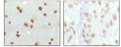 Figure 2: Immunohistochemical analysis of paraffin-embedded human cerebra (left) and lung carcinoma (right) tissues, showing nuclear localization with DAB staining using MDM4 mouse mAb.