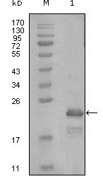 Figure 1: Western blot analysis using HAND1 mouse mAb against truncated Trx-HAND1 recombinant protein (1). |