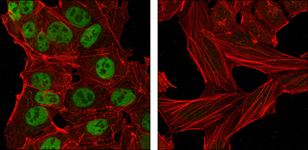 Figure 2: Confocal immunofluorescence analysis of NTERA-2 cells (left) and HeLa cells (right) using Nanog mouse mAb (green). Red: Actin filaments have been labeled with DY-554 phalloidin. |